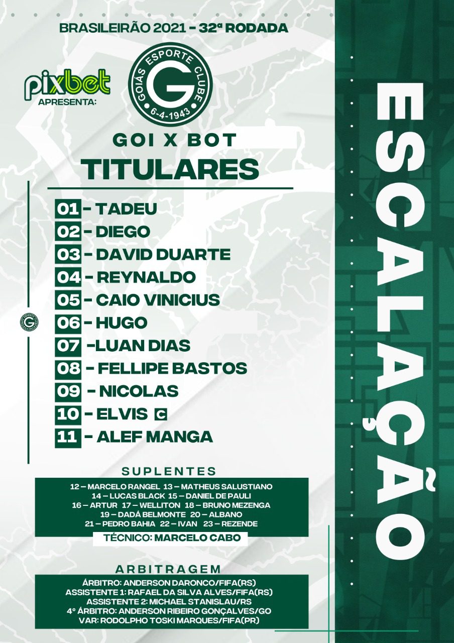 O Goiás está escalado com: Tadeu, Diego, David Duarte, Reynaldo e Hugo; Caio Vinícius, Fellipe Bastos, Luan Dias e Elvis; Alef Manga e Nicolas. Técnico: Marcelo Cabo