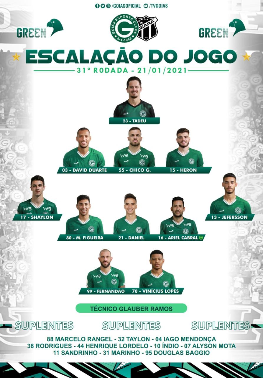 O Goiás está escalado com: Tadeu; David Duarte, Chico Grando e Heron; Shaylon, Miguel Figueira, Ariel Cabral, Daniel de Pauli e Jefferson; Fernandão e Vinícius Lopes. Treinador: Augusto César e Glauber Ramos