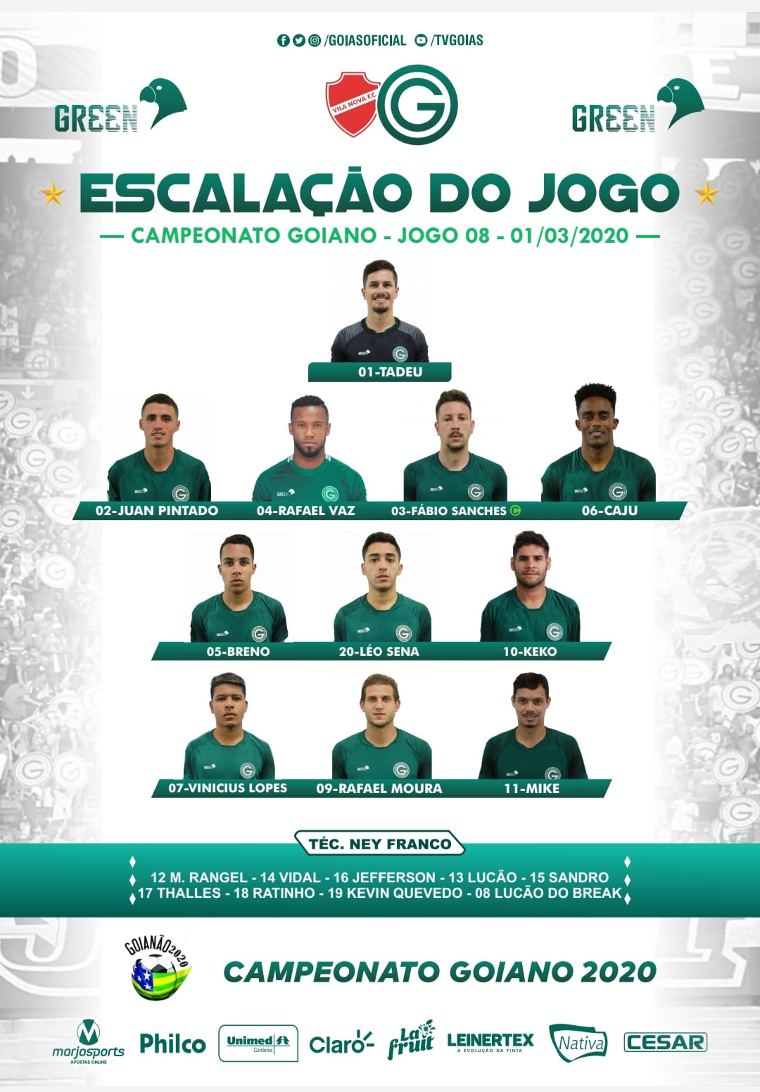 Outra novidade será no ataque com: Mike, Vinicius Lopes e Rafael Moura. Confira, a escalação oficial: