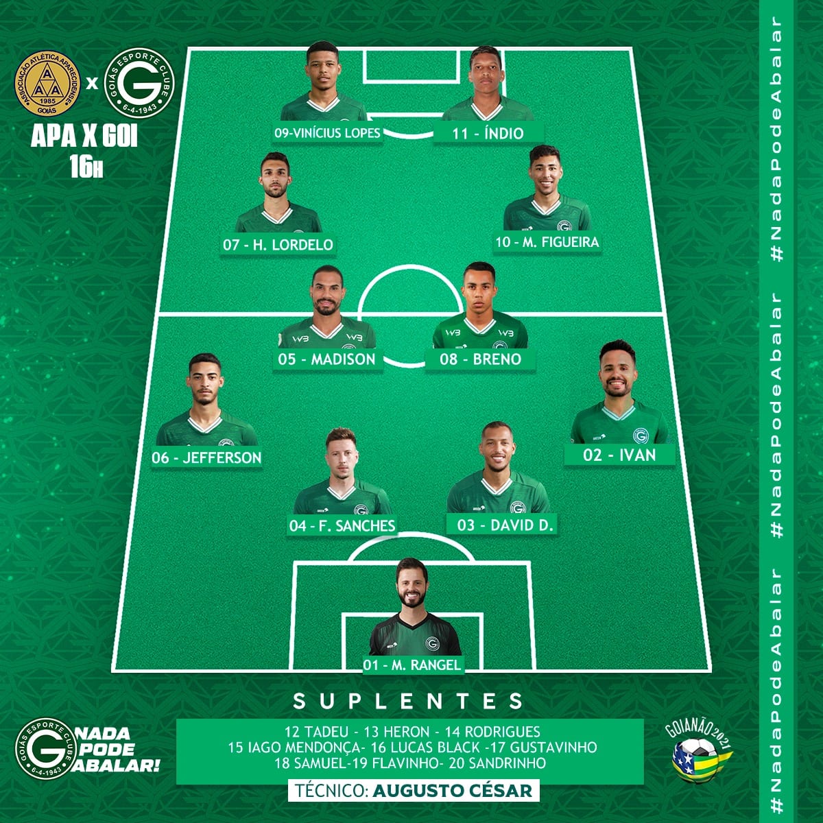 Diante disto, a reportagem do Portal Esmeraldino mostra como o técnico Augusto César confirmou a sua escalação para encarar a Aparecidense. Principalmente, os suplentes do Goiás que estarão à disposição no decorrer da partida no estádio Aníbal Batista.
