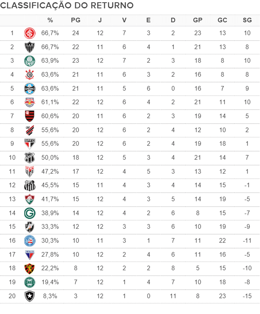 Brasileirão: veja a classificação do seu time no segundo turno do certame nacional