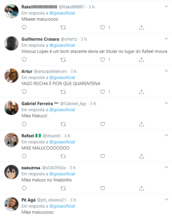 Além de exaltarem o gol marcado pelo Mike, outros torcedores esmeraldino não gostaram da atuação do lateral-direito Yago Rocha, que voltou ao time titular após a decisão da comissão técnica em utilizar o time misto na partida.