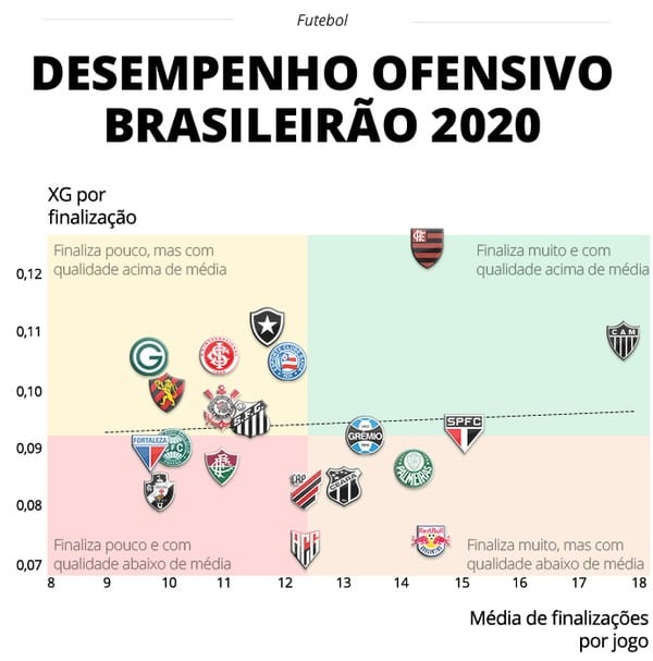 Por fim, o Ceará é uma das equipes que finaliza muito, mas qualidade abaixo da média. Sem contar, o Atlético-GO que está dividido entre o time que finaliza muito, mas com qualidade abaixo da média e também em determinados jogos está finalizando pouco.