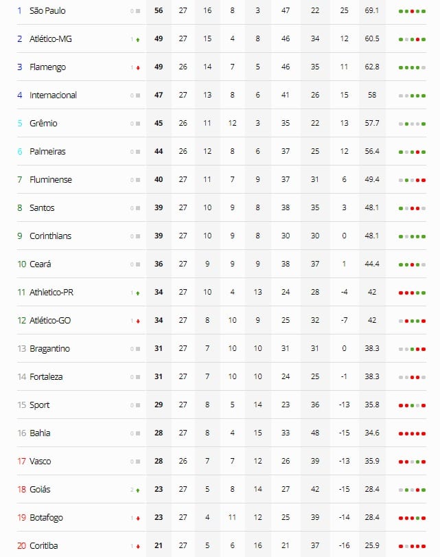 Com o término da 27ª rodada da Série A do Campeonato Brasileiro, a tabela de classificação foi atualizada e com novidades entre os times na parte de cima, no meio e na parte de baixo. Principalmente, com relação as equipes que estão brigando para escapar da zona do rebaixamento.