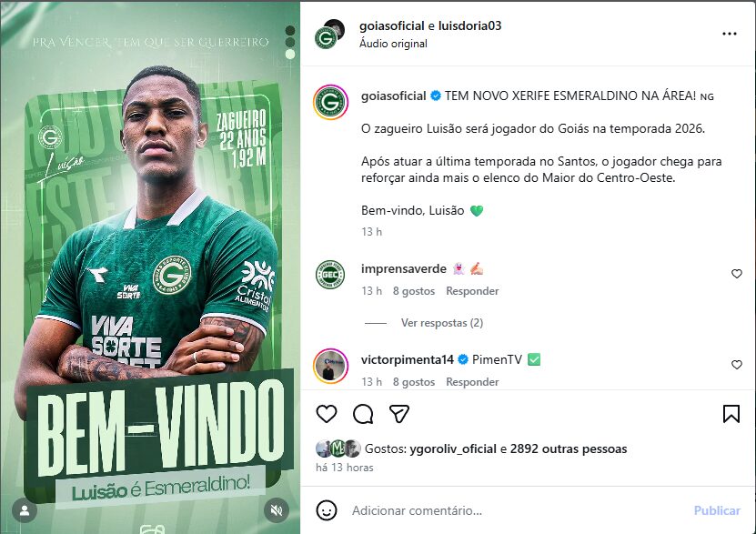 O zagueiro Luisão será jogador do Goiás na temporada 2026. Após atuar a última temporada no Santos, o jogador chega para reforçar ainda mais o elenco do Maior do Centro-Oeste.