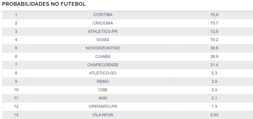 Segundo a Universidade Federal de Minas Gerais, as probabilidades do verde conseguir o acesso para a Série A neste momento estão na casa de 70,2%.