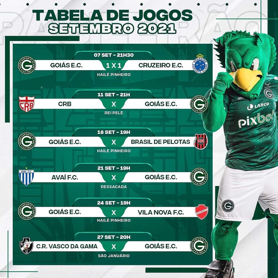 Tendo em vista que o mês de setembro reserva muitas emoções ao torcedor esmeraldino, o próprio Goiás fez questão de divulgar em suas redes sociais a tabela de jogos da equipe até o final deste mês. Confira a agenda esmeraldina em setembro: