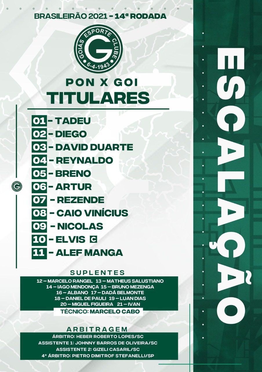 O Goiás está escalado com: Tadeu; Diego, David Duarte, Reynaldo e Artur; Caio Vinícius, Breno e Rezende; Elvis; Alef Manga e Nicolas (Bruno Mezenga). Treinador: Marcelo Cabo