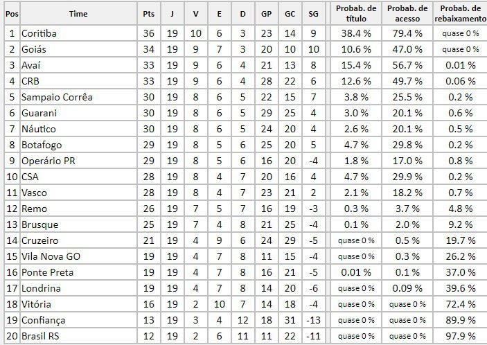 Diante disto, a reportagem mostra os dados que são do site chancedegol, com tudo o que você precisa saber sobre o duelo pela Série B do Campeonato Brasileiro e também as probabilidades de cada clube no torneio.