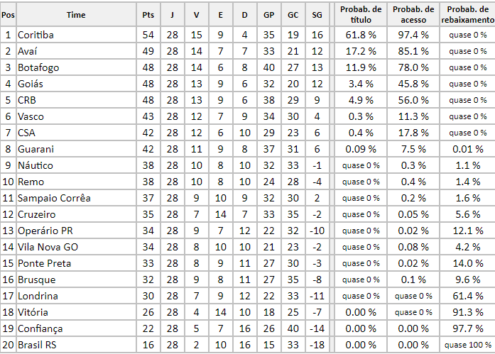 Depois do começo da 29ª rodada da Série B do Campeonato Brasileiro, as chances e probabilidades dos times na competição nacional. No entanto, o levantamento e números são do site chancedegol, que trouxe maiores detalhes e informações sobre o assunto.